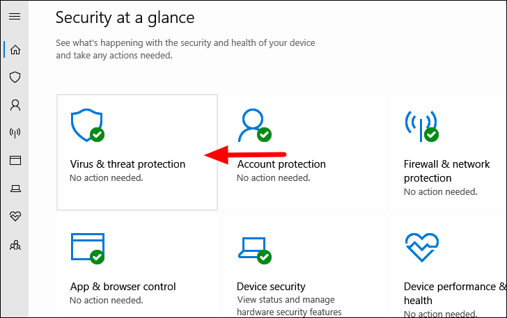 In the ‘Windows Security’ app, you will find multiple options listed on the home screen, select ‘Virus & threat protection’.