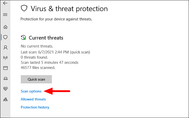 You will now find the ‘Quick scan’ opton listed on the screen. However, to fix the error, we need to run the full system scan. Next, click on ‘Scan options’.