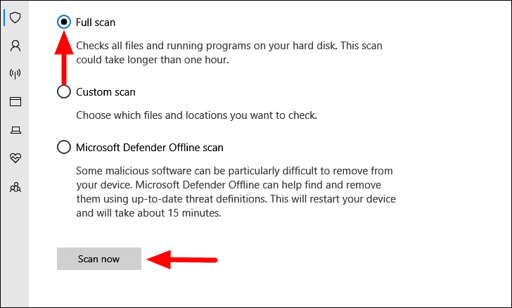 Now, select the checkbox for ‘Full scan’, and then click on ‘Scan now’ at the bottom.