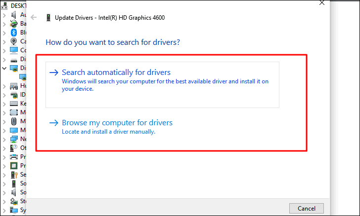 The ‘Update Drivers’ window will now launch with two options on the screen. The first option is to let Windows automatically search for the best available driver for your system or manually choose one and install it. It’s recommended that you let Windows search for the driver and install it, if one is available.