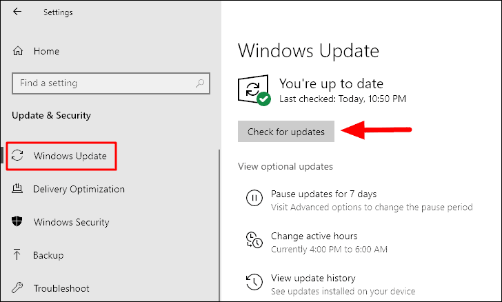 Now, in the ‘Windows Update’ tab, click on ‘Check for updates’. Any available updates will now be downloaded and installed on your system.