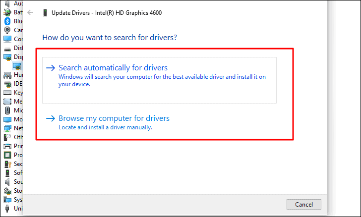 The Update Drivers window will open. You can now select whether you want to let Windows search the computer for the best available driver or install them manually. However, it’s recommended that you let Windows search for the driver. If you chose the second option, locate the driver file on your computer and install it.