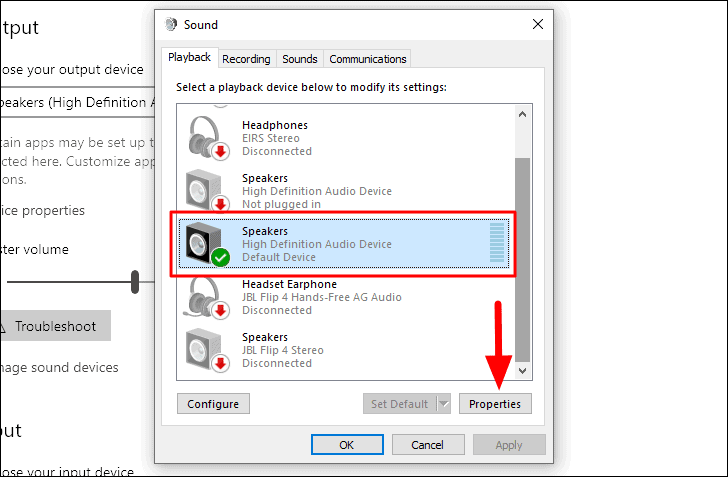 In the ‘Sound’ box, select the current playback device and then click on ‘Properties’ at the bottom.