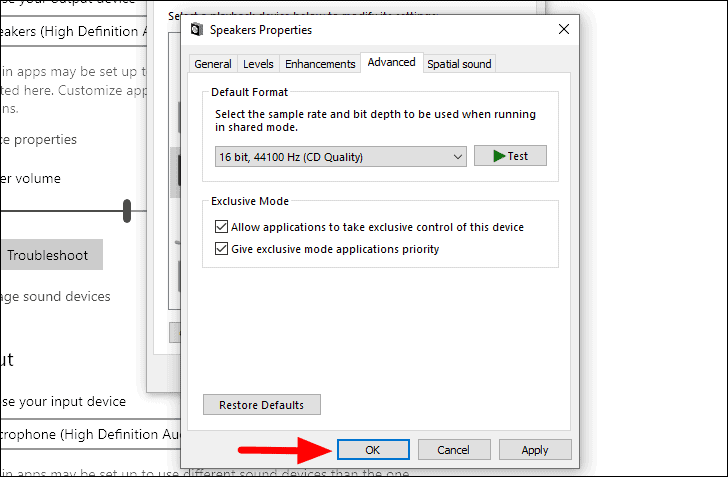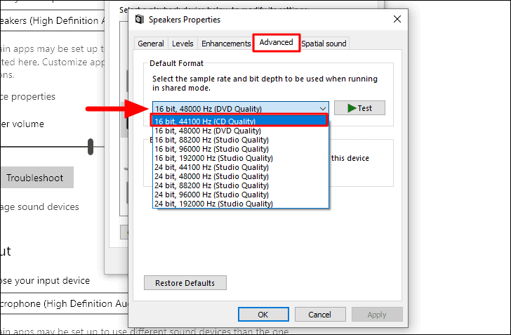 The ‘Speakers Properties’ box will open. Navigate to the ‘Advanced’ tab, click on the box and then select the first option from the drop-down menu.