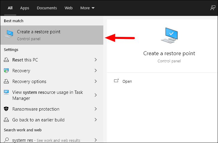 To restore the Windows, search for ‘System Restore’ in the ‘Start Menu’ and click on the ‘Create a Restore Point’ option from the search results.