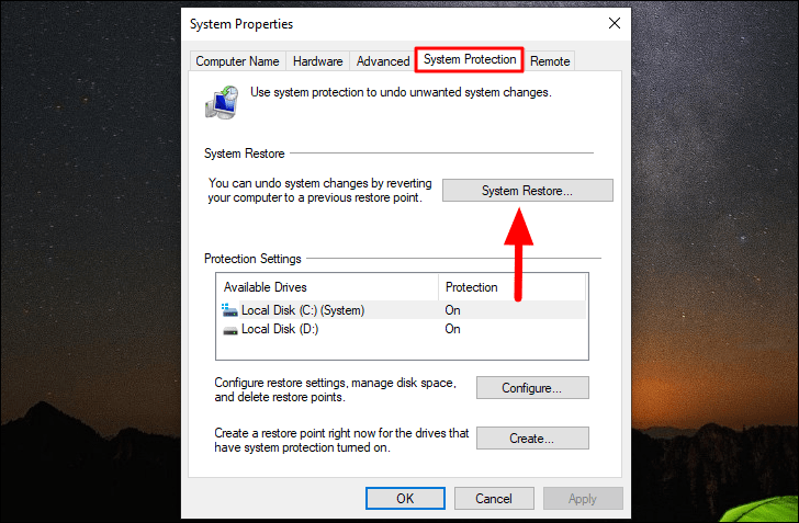 Next, click on ‘System Restore’ under the ‘System Protection’ tab.