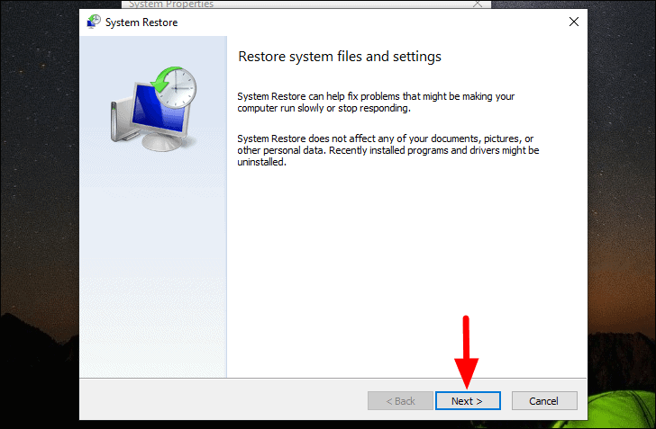 The ‘System Restore’ window will now open. Click on ‘Next’ at the bottom to proceed.