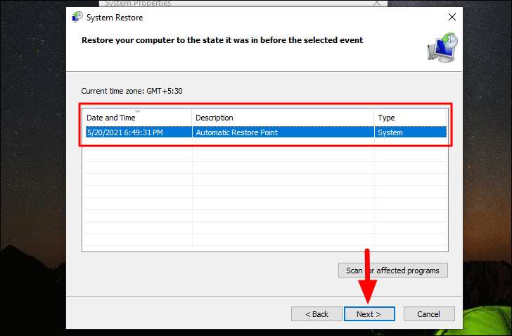 Next, select a restore point from the ones listed on the screen and click on ‘Next’ at the bottom.