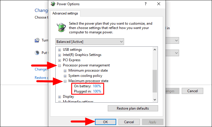 Next, double-click on ‘Processor power management’ and then on ‘Maximum processor state’ under it. You will now find two options, ‘On battery’ and ‘Plugged in’ with the processor rate mentioned in case of each. Now, click on the percentage and increase them to ‘100%’ in both cases and click on ‘OK’ at the bottom to apply the changes and close the window.