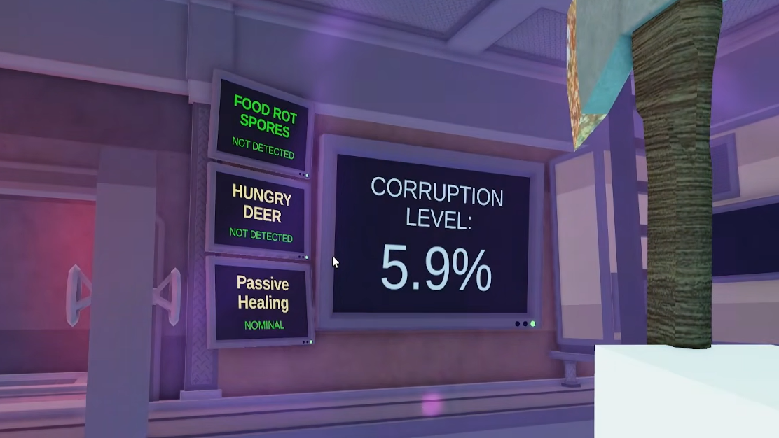 These debuffs layer on top of each other as corruption escalates. Early on, they may feel mild, but at high corruption, it is common to be hunted by hostile wildlife, unable to heal passively, starved for food, and under constant siege.