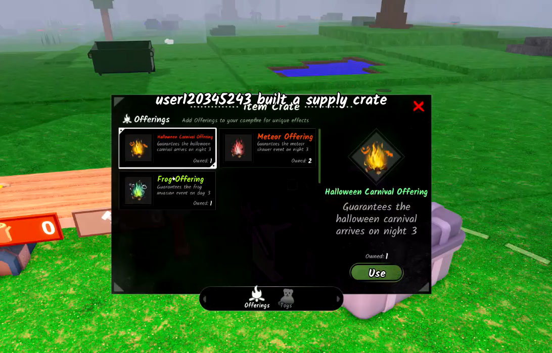 Before this mechanic, the main way to force an event was to use flame upgrades at the campfire, which locked event triggers behind specific consumables. Offerings sit alongside that system but shift the focus toward smaller, stackable buffs. Spawn-rate offerings like Coinsplosion, Red Chest, Apple Tree, and Fishing are not events at all, they are passive boosts to what the world generates, which is a different kind of power than forcing an alien or frog invasion.