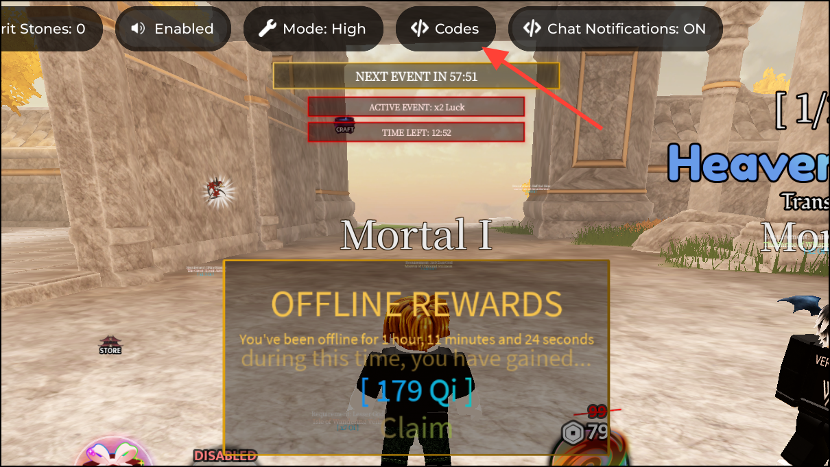 bigcode2500!— 15 Red Pills, 15 Golden Pills, 15 Yin-Yang Pills, 10 Sun Pills, 10 Void Pills, 5 Paradox Pills, 10 Ultra Red Pills, 35 Energy Rolls, 10 Luck Potions, 10 Roll Speed Potions, and 25k Spirit Stones NEWEvents!— 10 Sun Pills, 10 Energy Rolls, and 20k Spirit Stones NEWLimitedEvent!— 5 Ultra Red Pills, 8 Energy Rolls, and 5 Luck Potions NEWSorryForBugs!— 15 Ultra Red Pills, 15 Energy Rolls, and 15,000 Spirit StonesExpeditions!— 1 Paradox Pill, 5 Energy Rolls, and 5,000 Spirit StonesNEWPILLS— 2 Ultra Red Pills, 4 Energy Rolls, and 5,000 Spirit StonesQoLupdate— 1 Sun Pill, 5 Energy Rolls, and 5,000 Spirit Stonesbugfix!— 3 Void Pills, 5 Luck Potions, and 3 Energy Rollshotfix— 2 Luck Potions and 3 Energy RollsQIZONES— 6 Yin Yang Pills, 2 Luck Potions, and 3 Energy RollsRELEASE!— 1 Golden Pill, 5 Yin Yang Pills, 5 Luck Potions, and 5 Energy Rolls