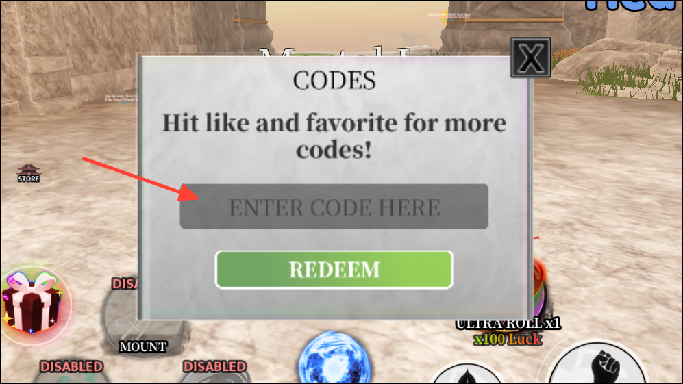 Step 2: Click the Codes button at the top of the screen to open the redemption window.
