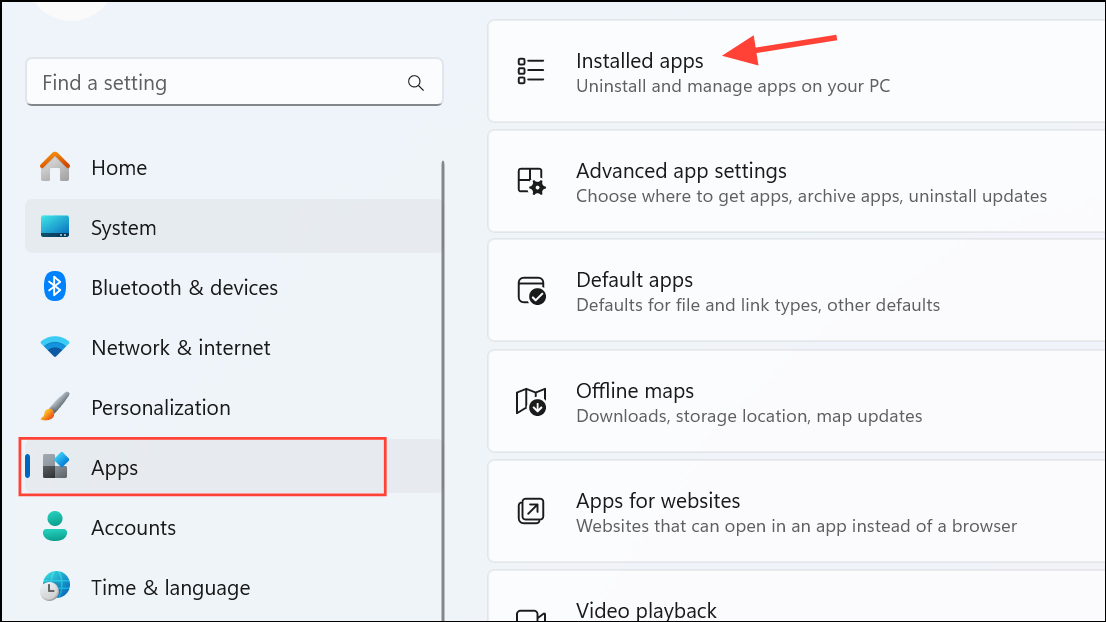 Step 1: Open Settings by pressing Windows + I. Go to Apps > Installed apps.