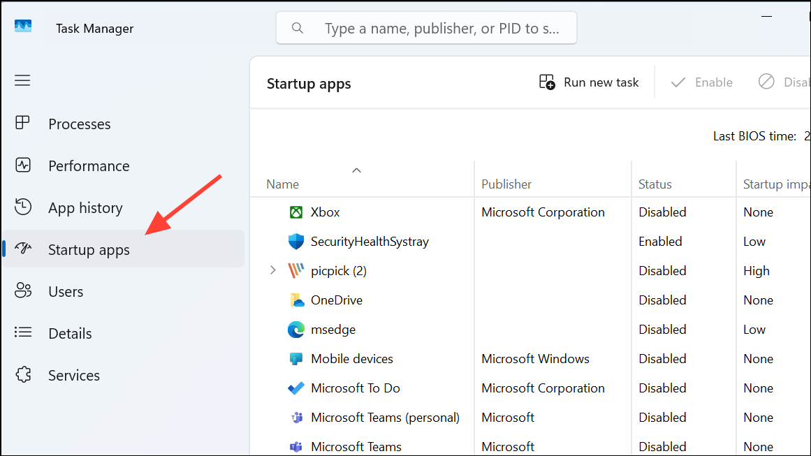 Step 1: Open Task Manager by pressing Ctrl + Shift + Esc. Click the Startup apps tab to view a list of programs that start with Windows.