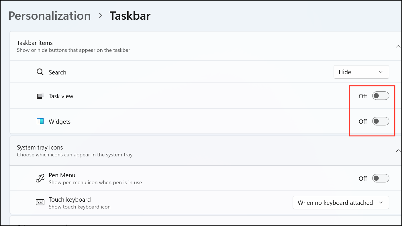 Step 2: Turn off widgets, chat, or other unused features by toggling their switches. This action removes unnecessary icons and streamlines the Taskbar.