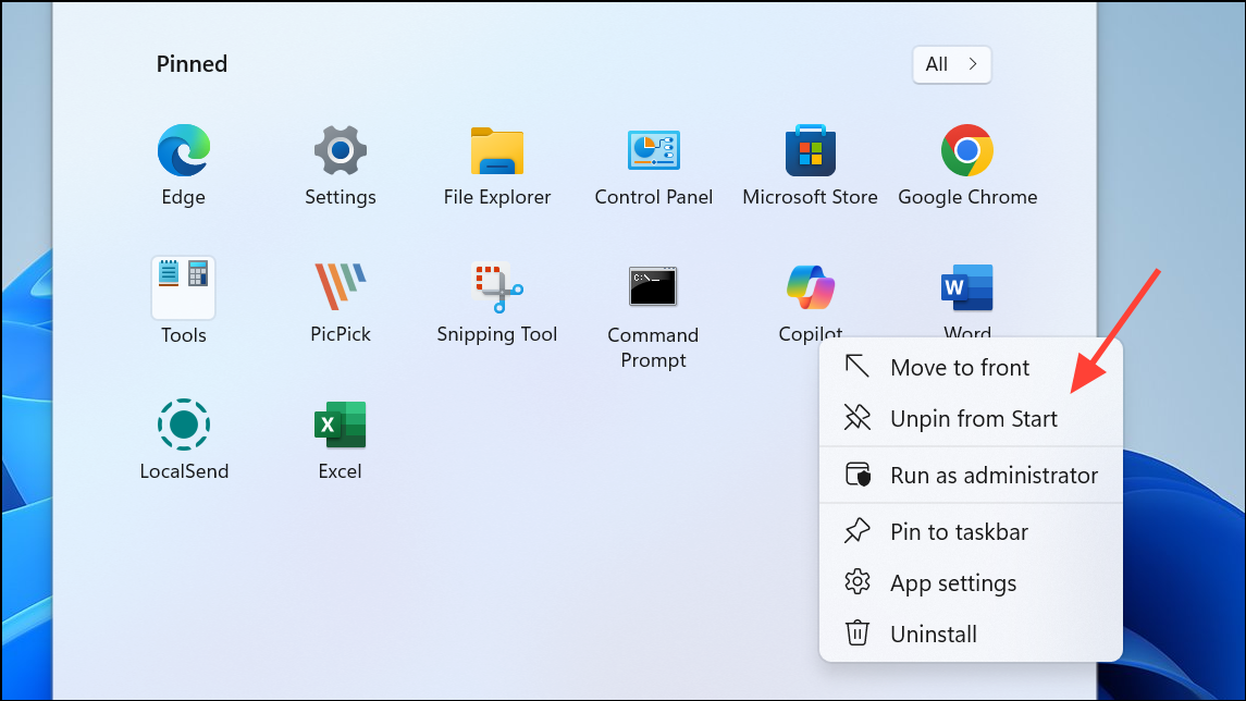 Step 3: Open the Start menu, right-click any unwanted pinned apps, and select Unpin from Start. Pin your most-used apps for quicker access. This makes the Start menu less crowded and more relevant to your workflow.