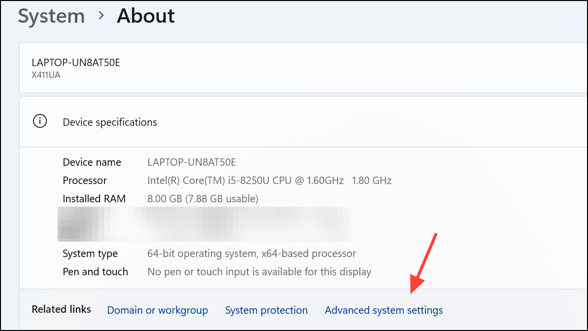 Step 2: On the About Page, click on Advanced system settings.