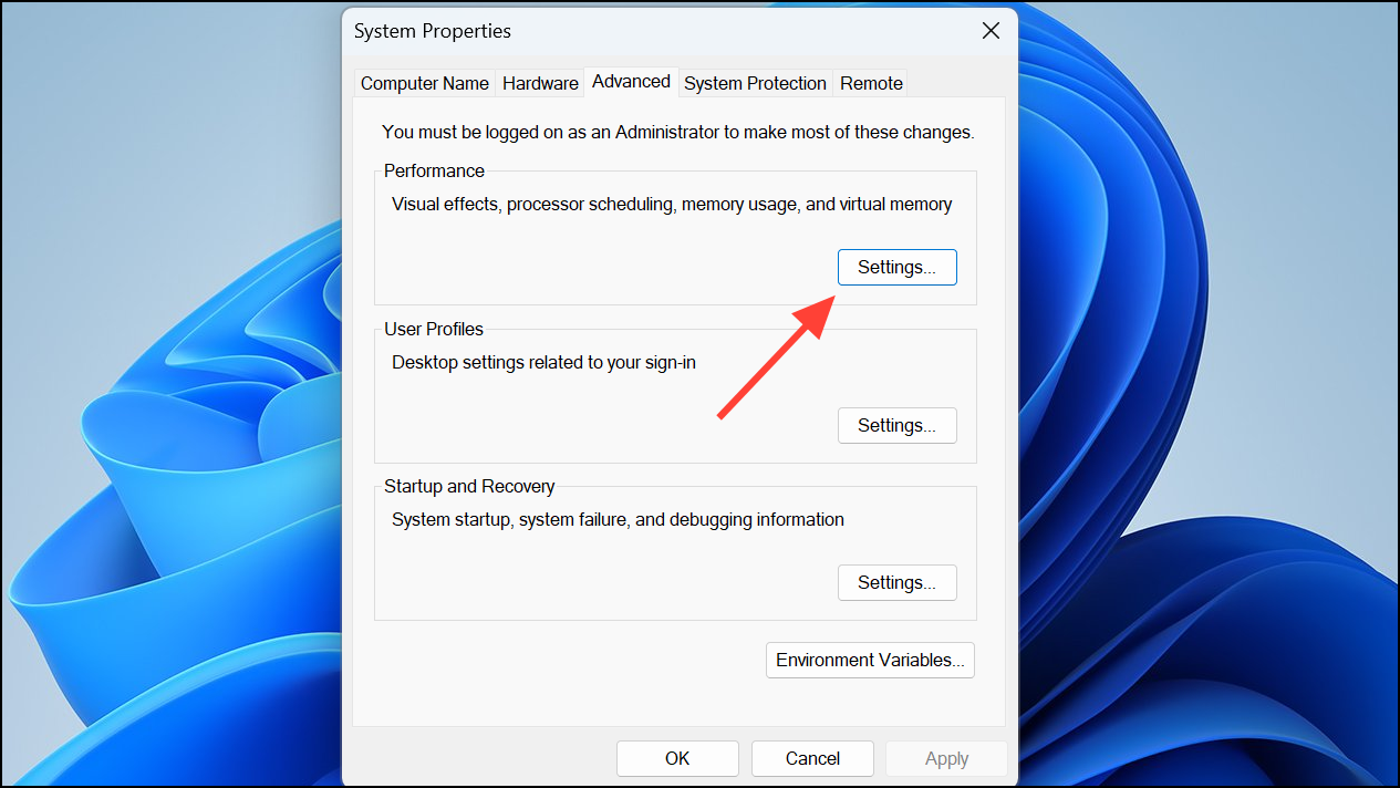 Step 3: In the System Properties window, click Settings under the Performance section.