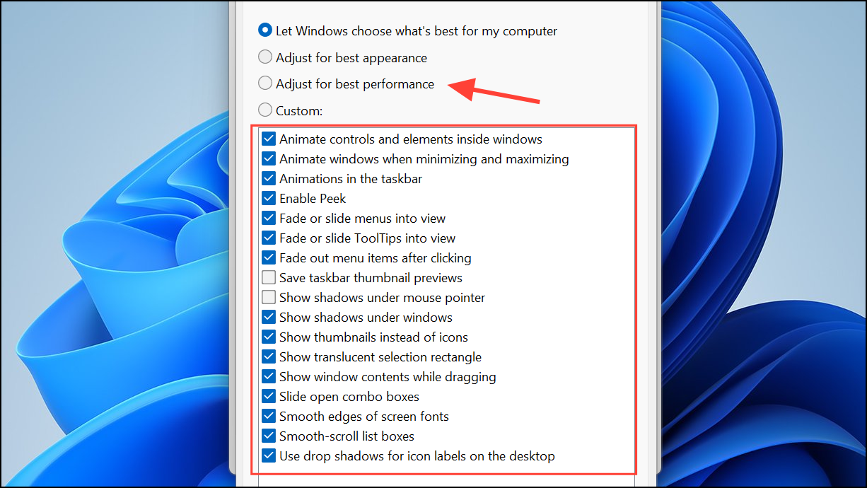 Step 4: Select Adjust for best performance or manually disable specific effects like animations and transparency. Click Apply to save changes. The desktop will feel snappier, and system resources will be freed up for other tasks.