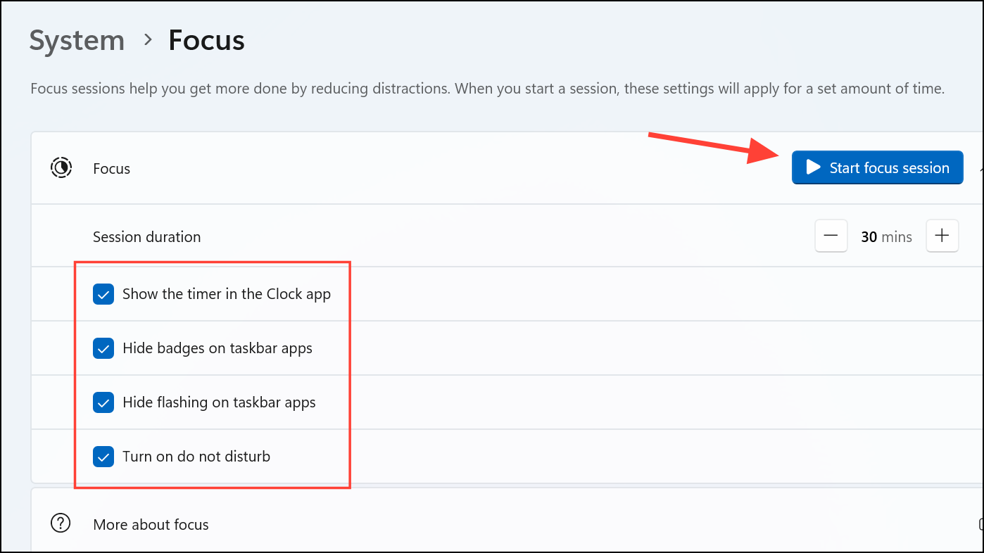 Step 4: You can then set up and customize Focus sessions, which will block notifications and other interruptions, preventing you from getting disturbed. Focus mode also lets you turn on Do Not Disturb mode for specific periods, such as work hours or presentations, which suppresses unnecessary alerts. This feature ensures you remain focused and undisturbed.