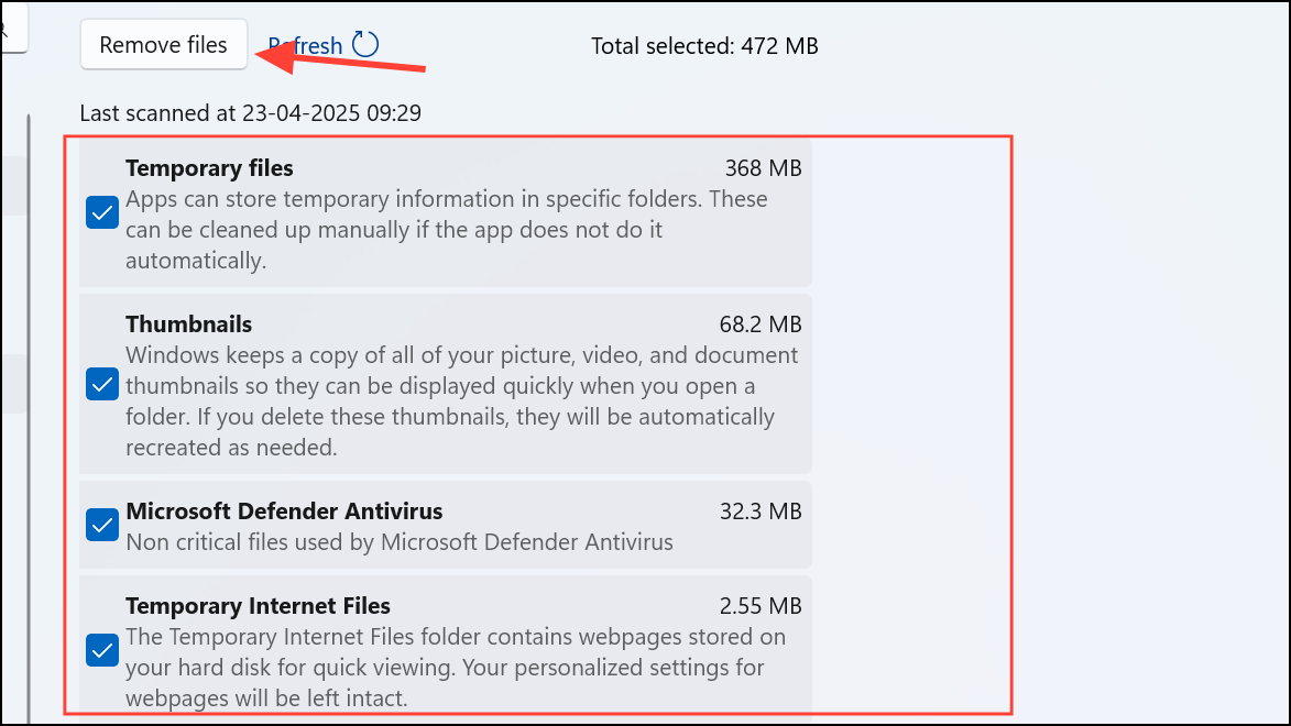Step 3: Check the boxes for items you want to remove and click Remove files.