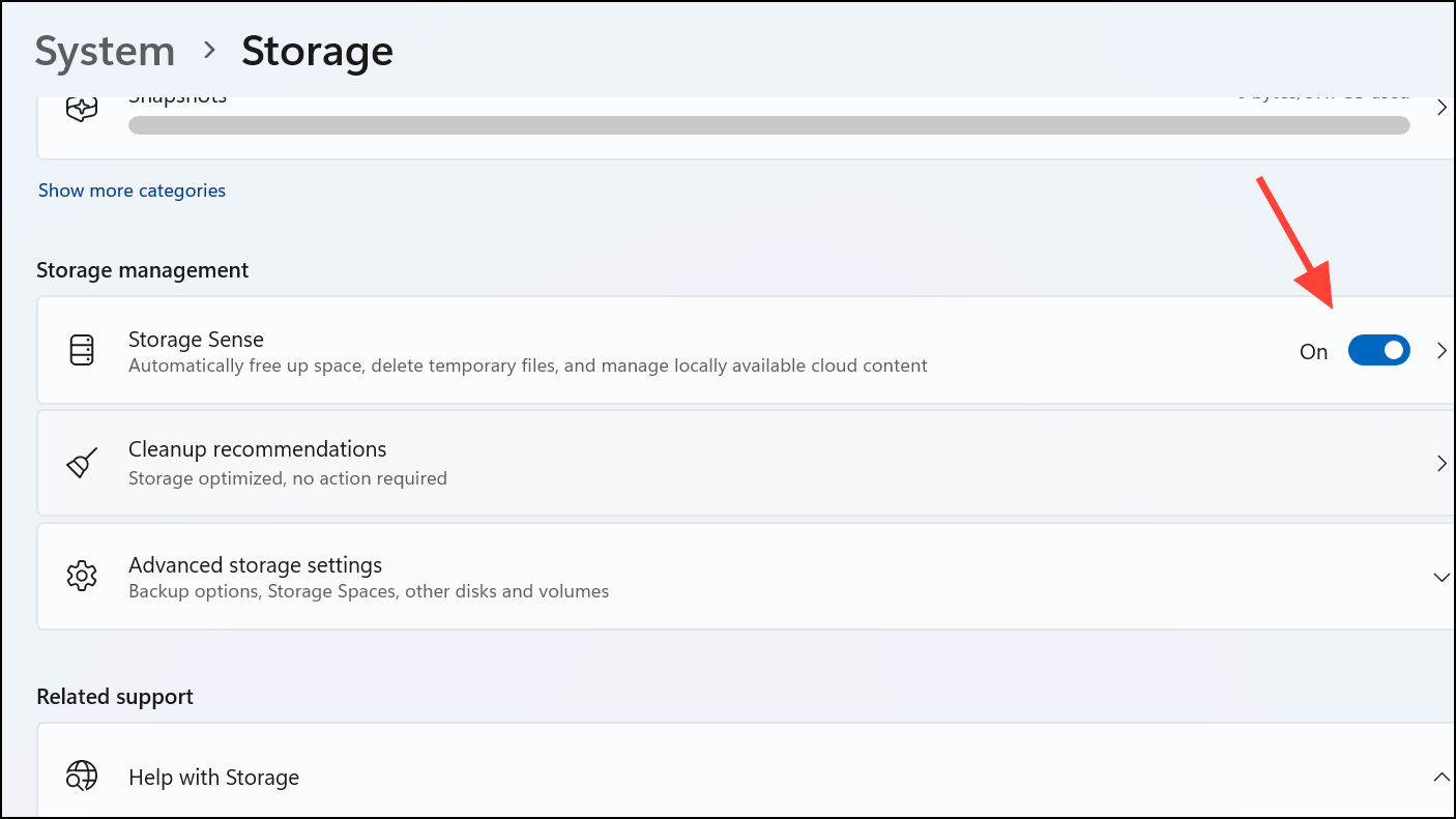 Step 4: For ongoing maintenance, go back and turn on Storage Sense to automatically delete temporary files and manage space in the background.