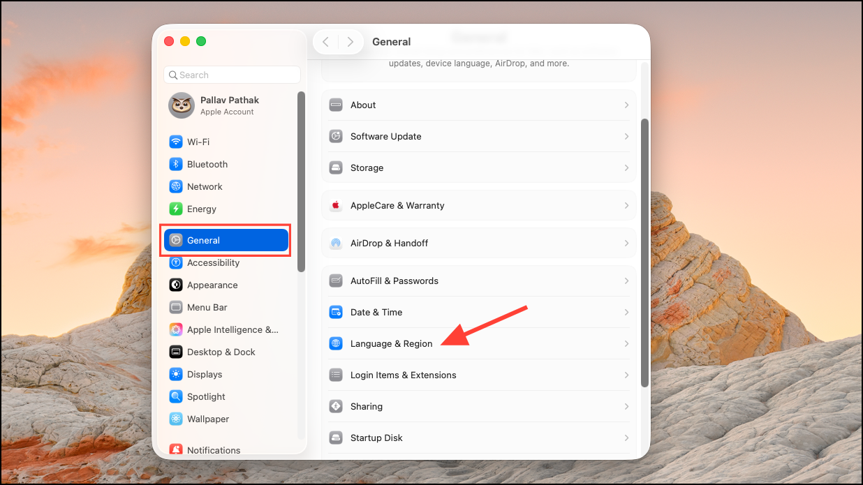 Step 1: Open System Settings from the Apple menu. Select General, then choose Language & Region. Here, set your primary language and add any preferred languages you want to use for translation. Setting these ensures the system knows which languages to translate between in supported apps.