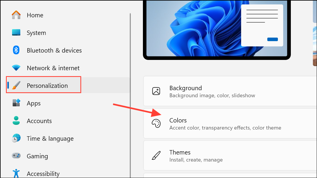 Step 1: Open the Settings app by clicking the Start button and selecting the gear icon, or by pressing Windows + I. In the sidebar, select Personalization, then click Colors.