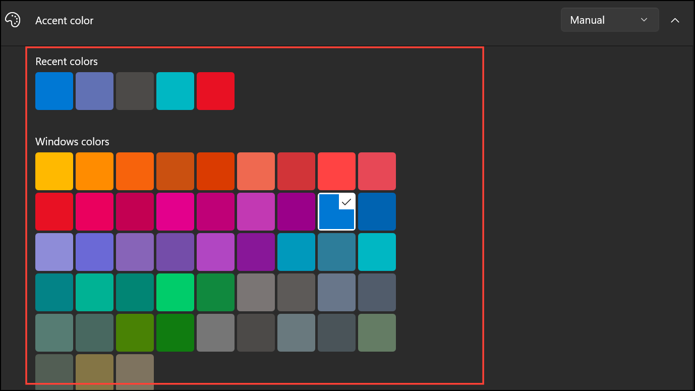 Step 3: Scroll down to the Accent color section. You can either let Windows automatically pick an accent color from your wallpaper by choosing Automatic, or manually select a color by picking Manual and choosing from Windows colors, Recent colors, or by clicking View colors for a color picker.