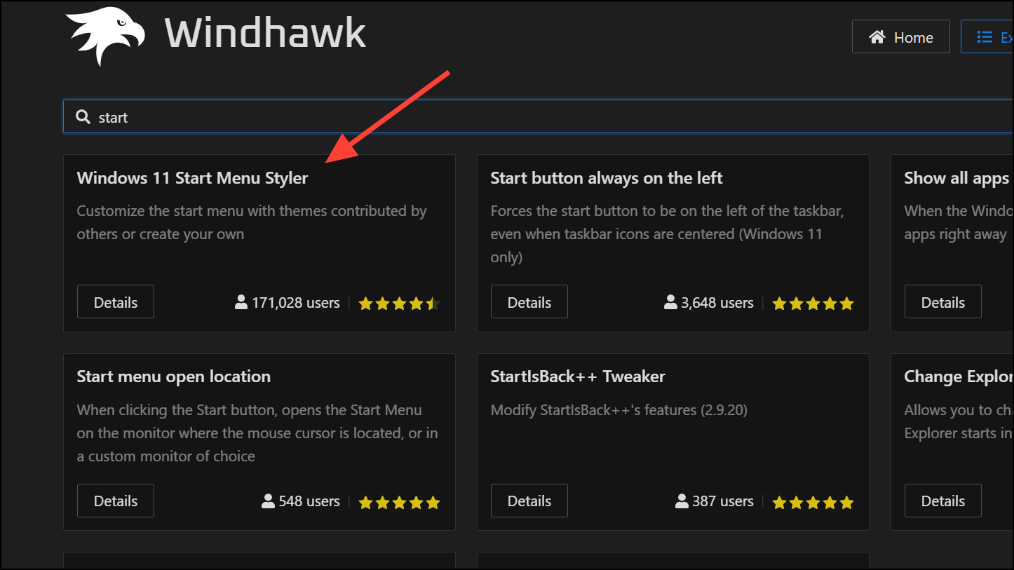 Step 2: After installation, open Windhawk and go to the Mods section in the upper right menu. Search for and install the Windows 11 Start Menu Styler mod. This mod enables theme integration and advanced customization options for the Start menu.