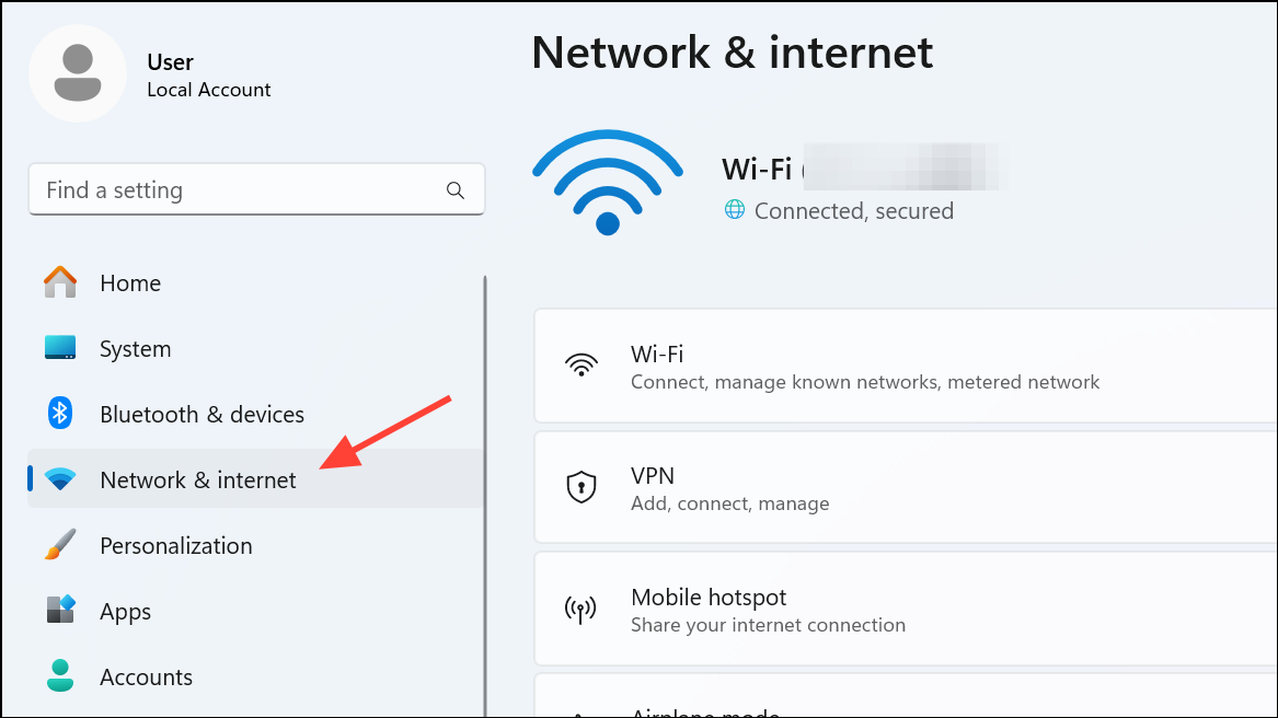 Step 2: In the Settings window, choose Network & internet from the sidebar. Here, you’ll see your current network connections—either Wi-Fi or Ethernet.