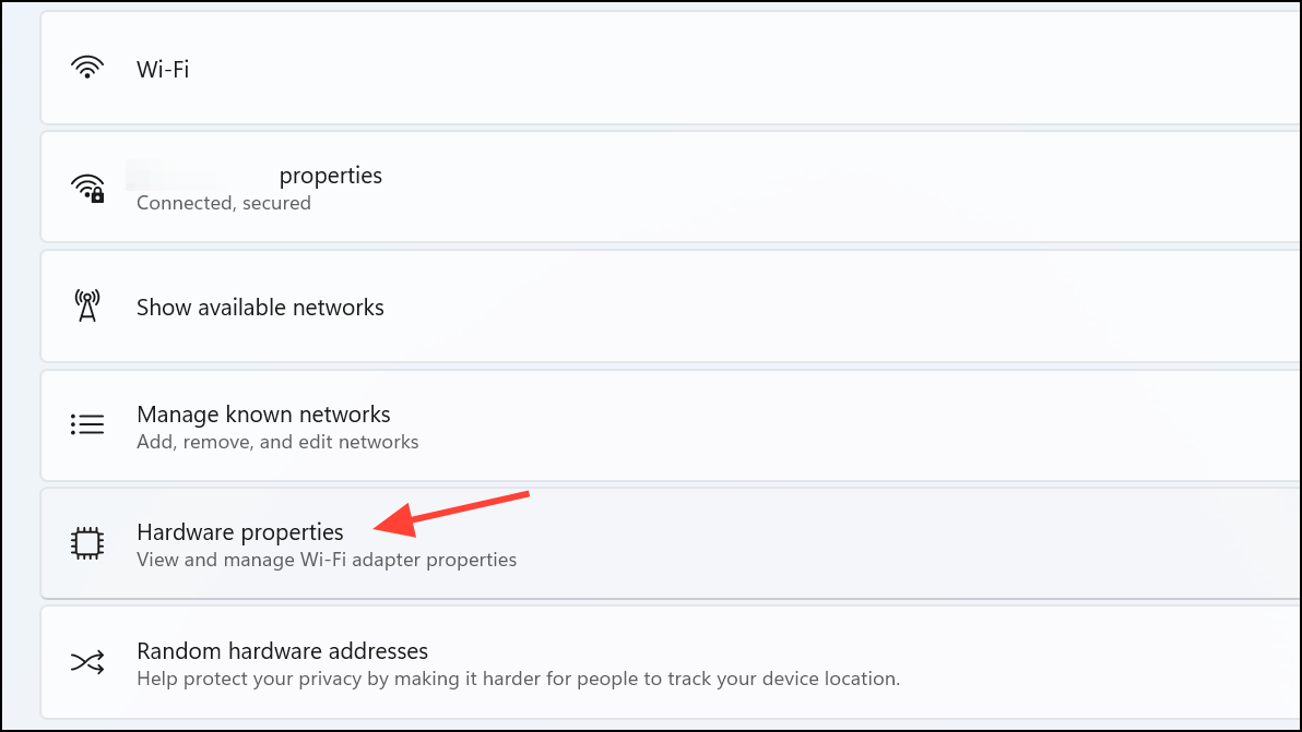 Step 3: Select your active connection. For Wi-Fi, click Wi-Fi, then choose Hardware properties. For Ethernet, click Ethernet.