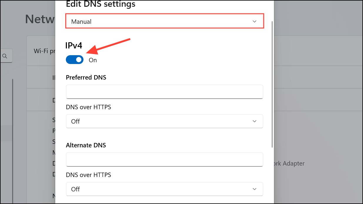 Step 5: In the pop-up window, switch the drop-down menu to Manual. Toggle IPv4 (and optionally IPv6) to On.