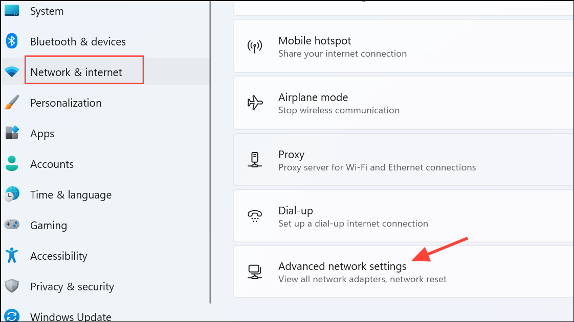 Step 1: Press Windows + i to open Settings, then go to Network & internet and select Advanced network settings at the bottom.