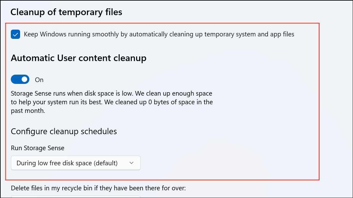 Step 4: Click on Storage Sense to access its detailed settings. Here, you can specify how often Storage Sense runs (daily, weekly, or monthly), choose whether it deletes files from your Downloads folder, and set the retention period for files in the Recycle Bin.