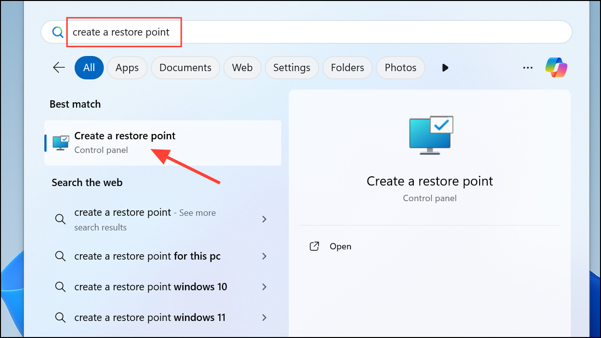 Step 1: Type Create a Restore Point in the Windows search bar and open the corresponding control panel.
