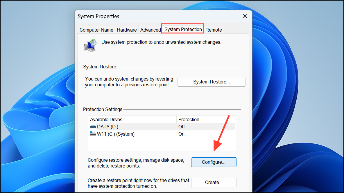 Step 2: Under the System Protection tab, select your system drive (usually C:) and click Configure.