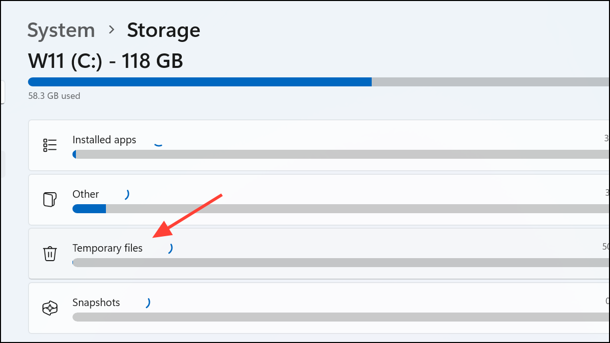 Step 2: Click on Temporary Files to view categories like app caches, thumbnails, and previous Windows installations.