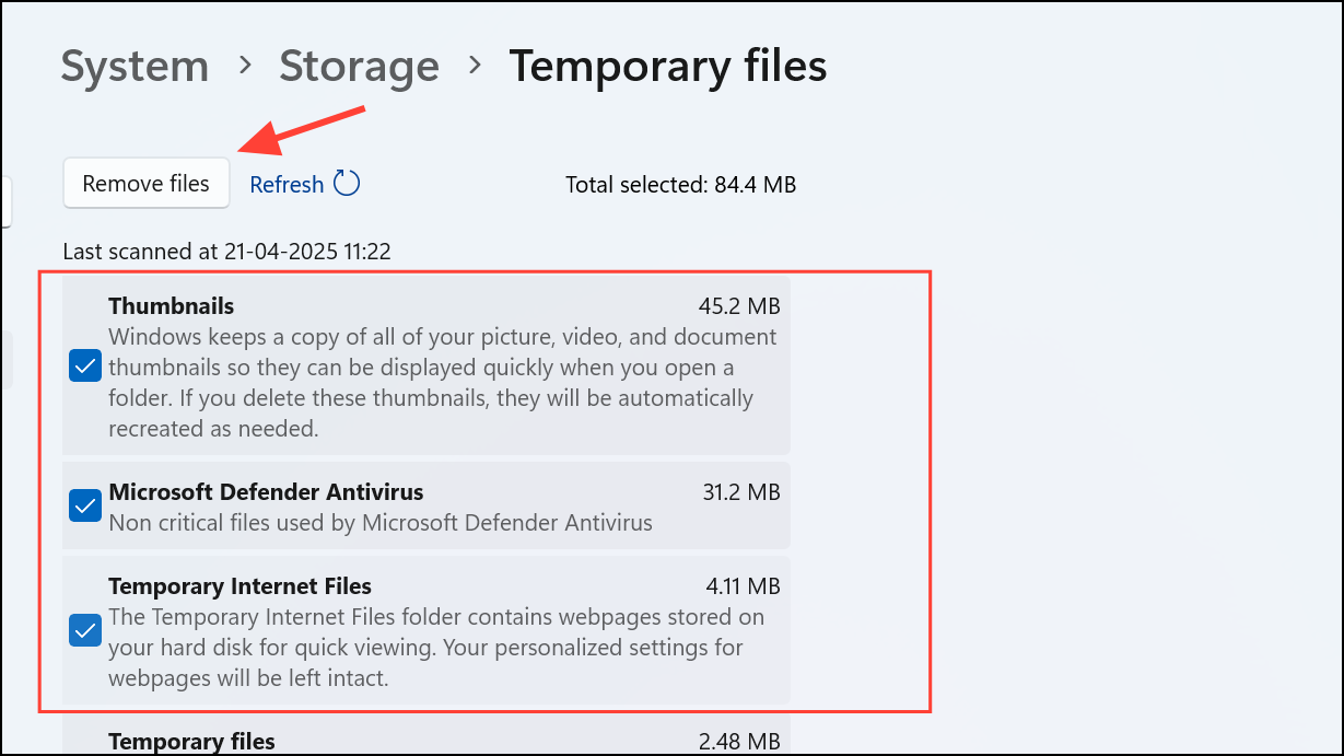 Step 3: Select the types of temporary files you want to remove and click Remove files.