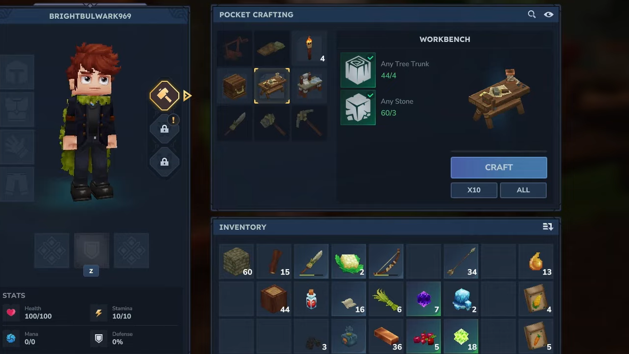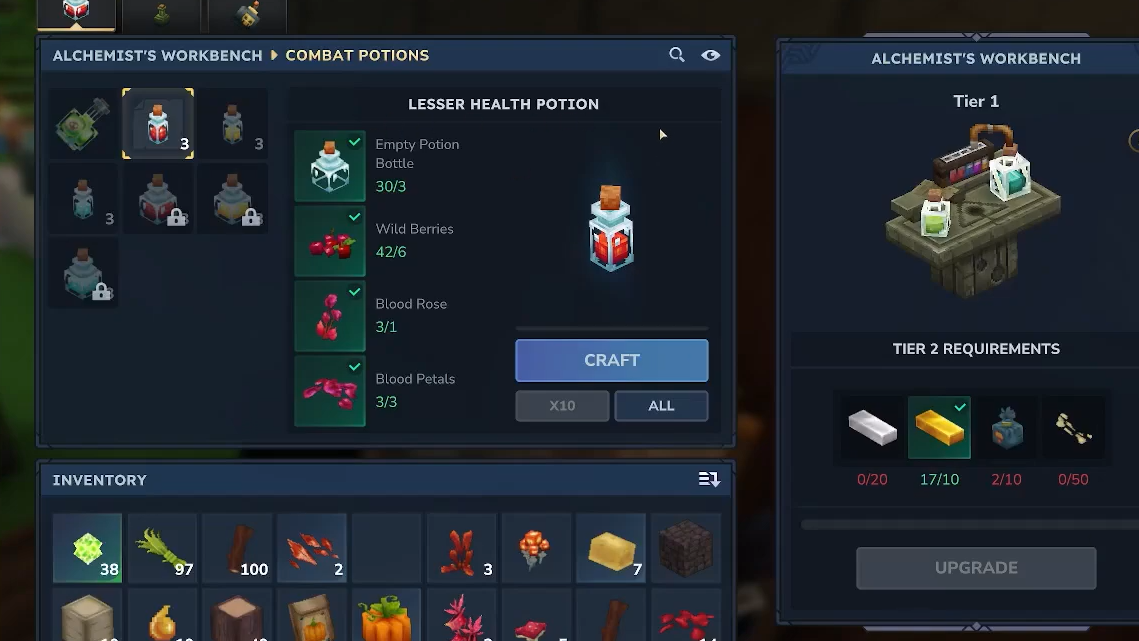First, it improves survivability. Healing potions let you stay in the field longer instead of retreating to your base every time your health dips. Combined with armor from the Armorer’s Workbench and food from the Farmer’s Workbench, you can tackle longer dungeons in a single run.