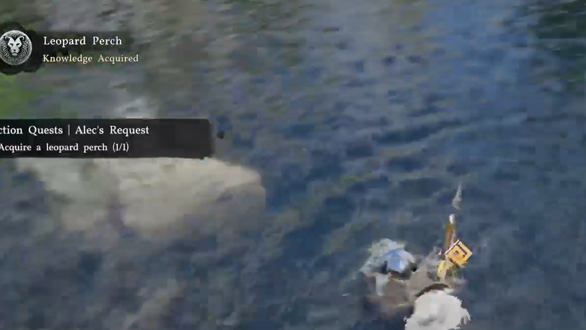 Quick answer: Jump into any shallow body of water near the Greymane camp, swim up to a Leopard Perch, and press the interact button to grab it. Return to Alec to complete the quest and receive a Medium Bag.