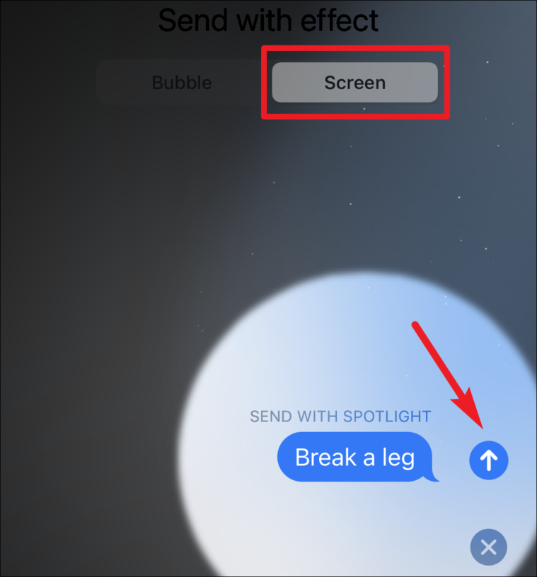 The effects screen will open. Select ‘Screen’ from the options at the top. Then, swipe right and left to choose from the effects available. Tap the ‘Send’ button to send a message with the selected effect.