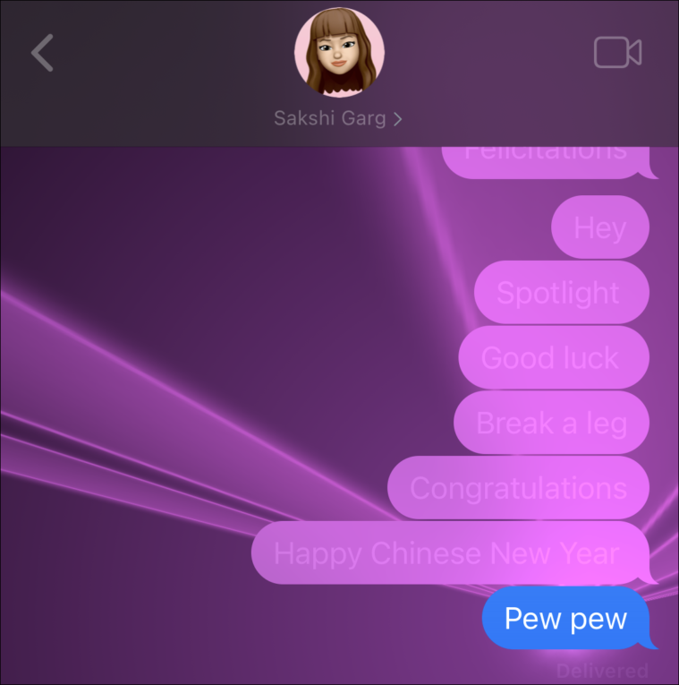 Note: Although we’ve included some examples from other languages, it’s not the whole extent of it. You can experiment with sending the same message in other languages as well. It won’t work with every effect, though. For example, the laser effect works only with “Pew Pew” and not its translations in other languages.