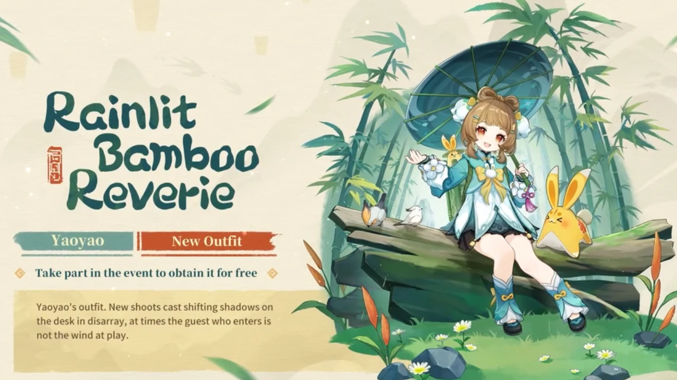 Yaoyao receives a free Lantern Rite-themed costume called Rainlit Bamboo Reverie. Unlike the Traveler’s outfit, this one is attached to a limited-time event but is free to unlock during its run.