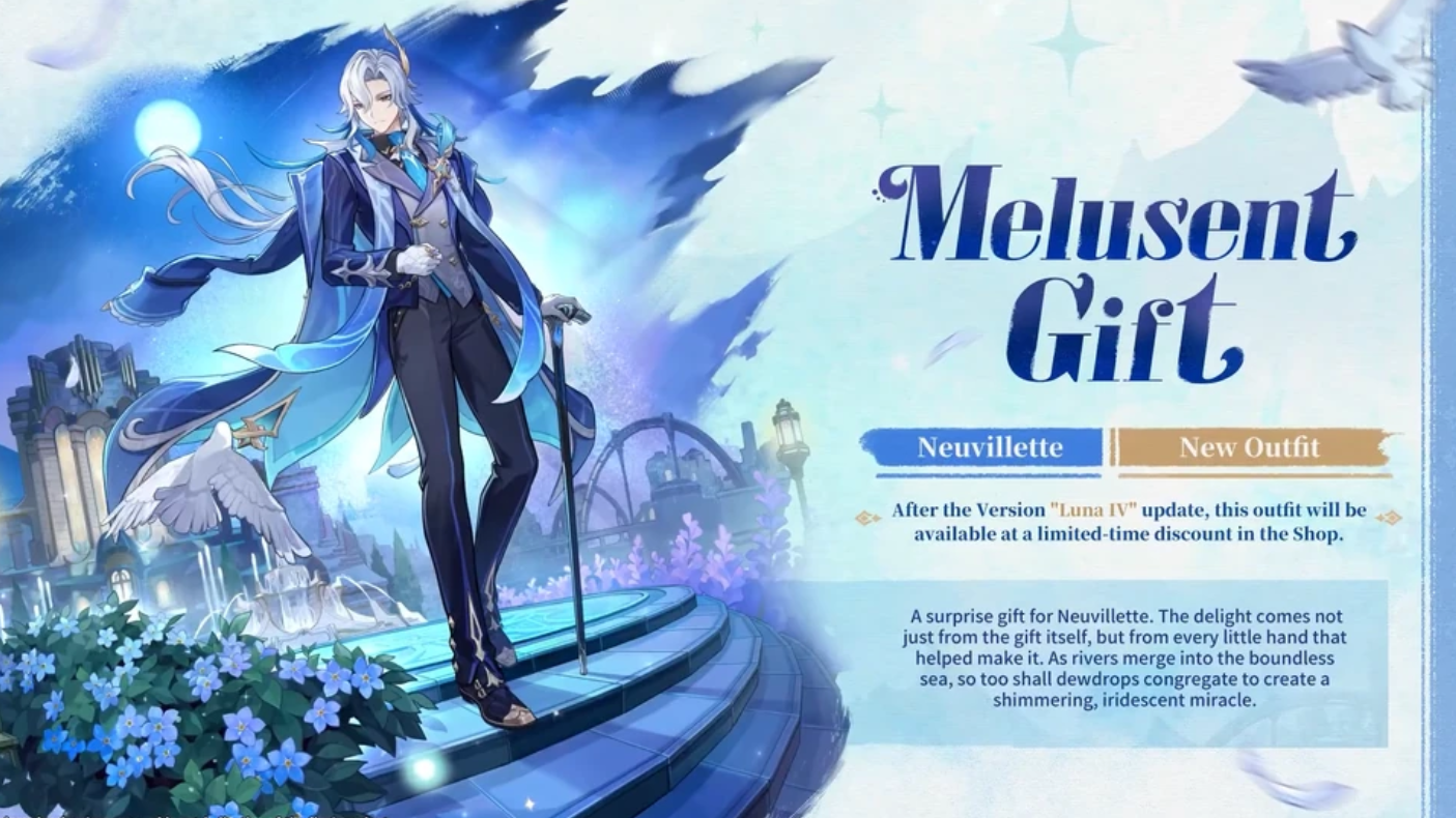 - Neuvillette’s Melusent Gift is aligned with his Phase 2 rerun banner. The skin is sold at a discount for the length of Luna IV, matching his banner window, then increases in cost afterward.