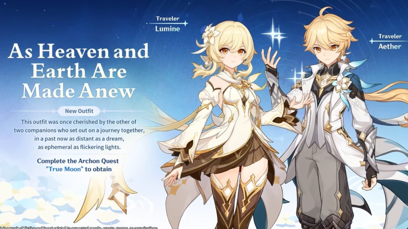 The Traveler finally gets full alternate costumes in Luna IV, one for Aether and one for Lumine, grouped under a shared name: “As Heaven and Earth Are Made Anew”. These are free outfits, but they’re locked behind the latest Archon Quest content.