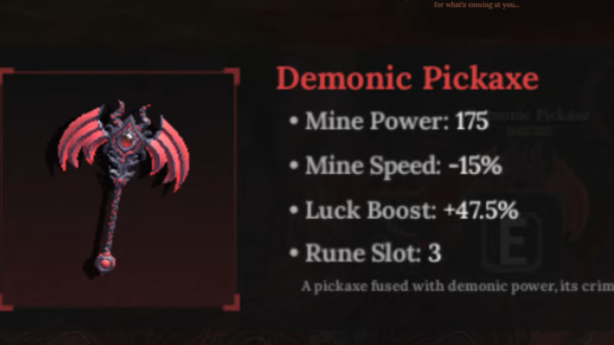 The Demonic Pickaxe demands a heavy gold investment, but it pushes mining power to 180, nearly doubles down on luck compared with mid‑tier tools, and continues the three‑rune‑slot pattern. The only major drawback is a slight hit to mining speed. In practice, it sits just above Magma in raw effectiveness without completely trivializing earlier content.