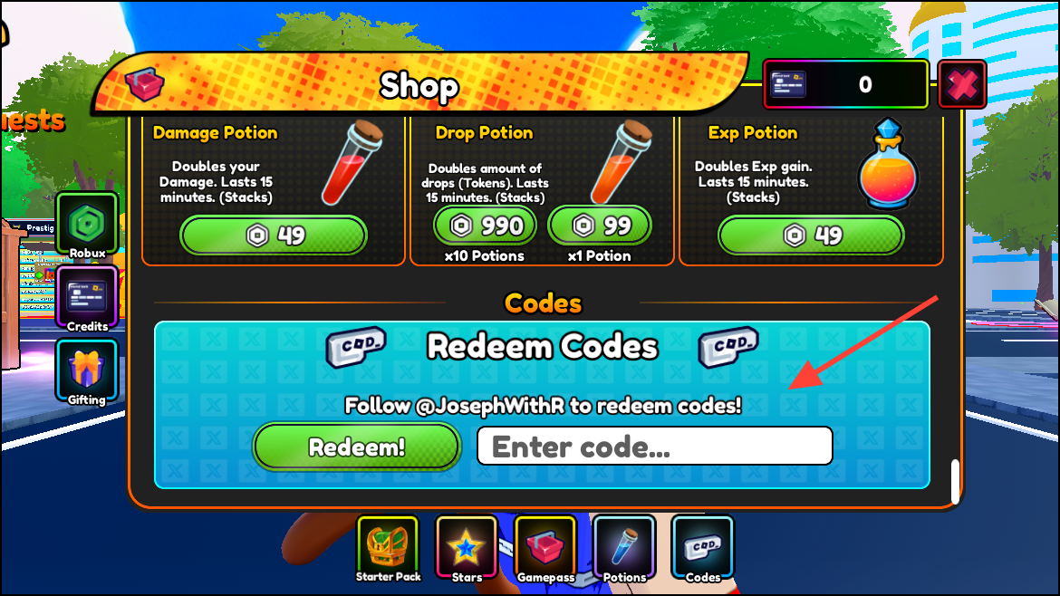 Step 3: Scroll to the bottom of the Shop menu to find the Redeem Codes field.