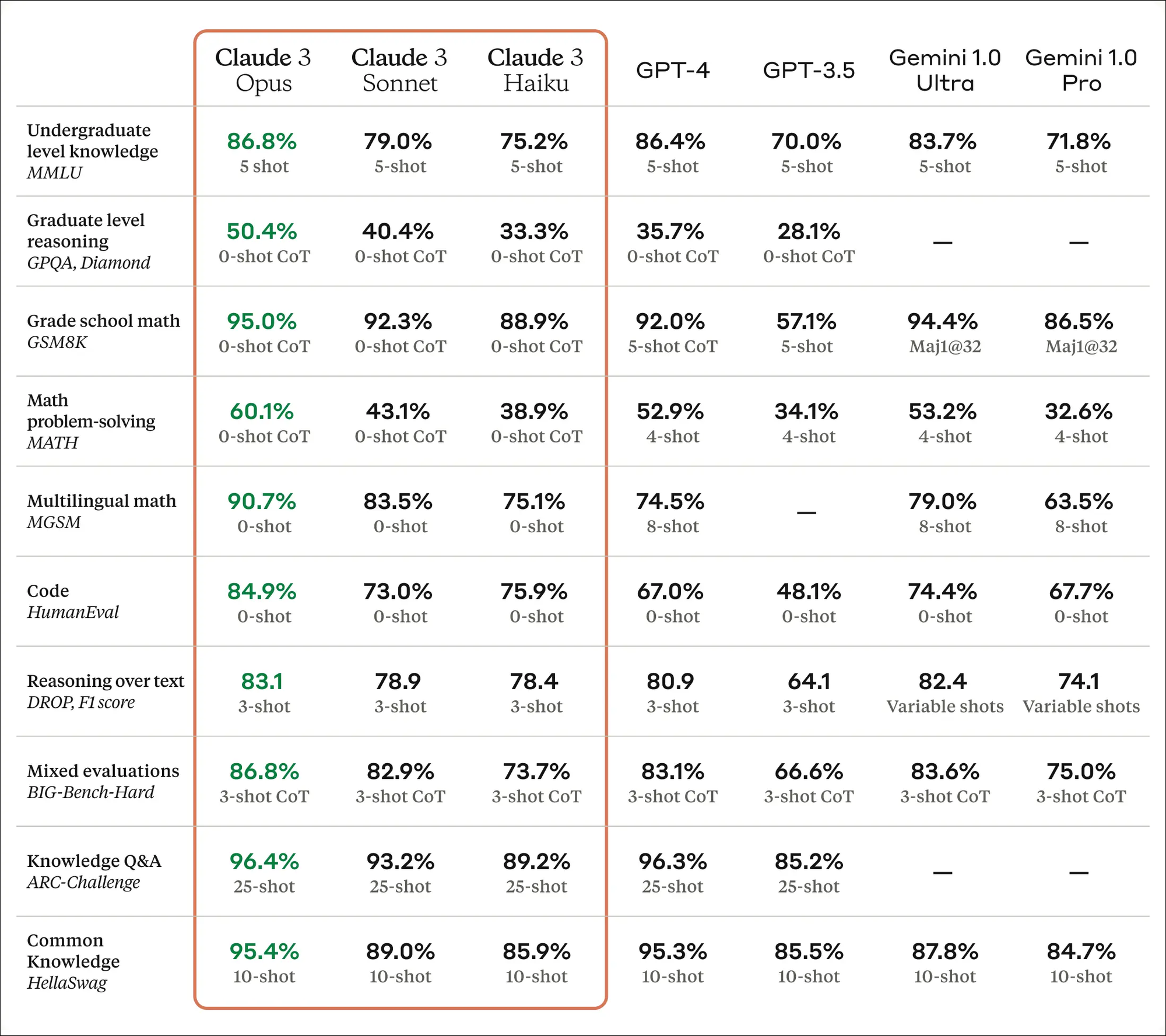 The Claude 3 models are considerably raising the bar on performance, with Opus exceeding the capabilities of its peers, like GPT-4 and Gemini 1.0 Ultra, in most benchmark tests, like knowledge, reasoning, Math, coding, etc.